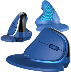 Ergonomska brezžična vertikalna miška DELUX M618XSD prinaša udobje in zmogljivost za delo in zabavo. Ponuja vertikalno zasnovo za razbremenitev zapestja, 3 načine povezave (USB‑C, 2,4 GHz, Bluetooth 4.0), OLED zaslon, nastavljiv DPI 600–4000 in dolgo avtonomijo z baterijo 1000 mAh. Priložena je magnetna opora za zapestje ter prilagodljiva RGB osvetlitev.