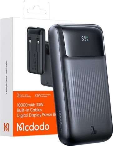 Kompaktna powerbanka Mcdodo s kapaciteto 10.000 mAh in močjo do 33 W zagotavlja hitro polnjenje telefonov in tablic. Zahvaljujoč vgrajenima kabloma USB‑C in Lightning je idealna za iOS in Android, ponuja PD 3.0 / QC 3.0 ter podporo Samsung SFC in Huawei SCP. Praktičen digitalni zaslon prikazuje natančno stanje baterije, napredni zaščitni mehanizmi pa zagotavljajo varno delovanje – tudi pri potovanju z letalom.