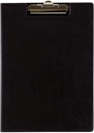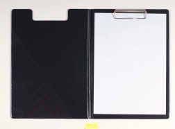 Zapirajoča pisalna podloga s kovinsko sponko, izdelana iz izjemno trdnega lepenkastega materiala z notranjim prozornim žepom.