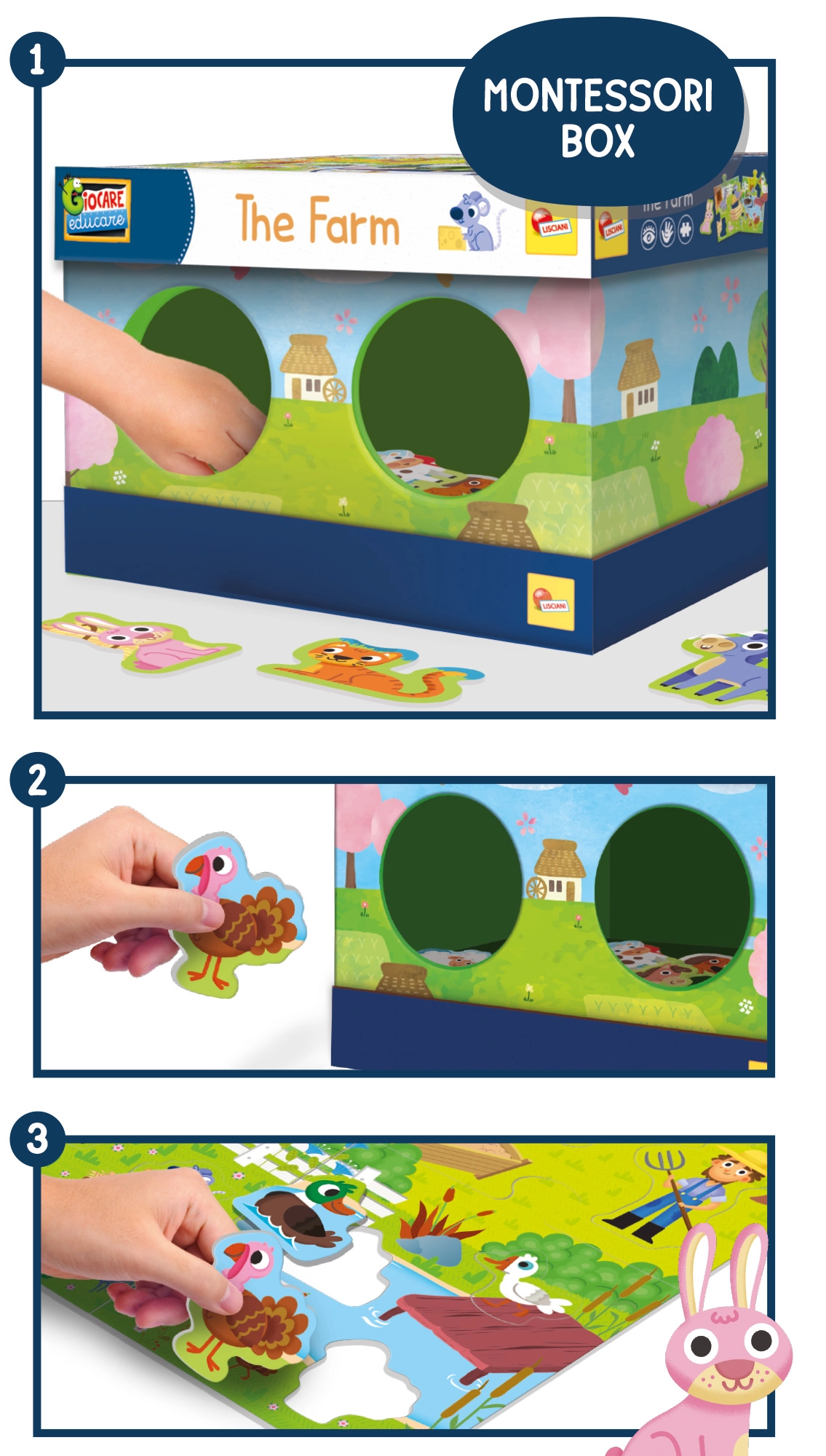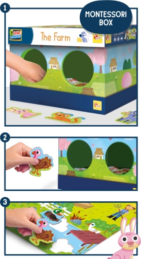 Otipna škatla v slogu Montessori navduši vsakega otroka, ki ima rad kmetijo in živali. Z igro na slepo otroci spoznavajo oblike, vadijo zbranost in se učijo povezovati posamezne koščke po otipu in vidu. Zložljiva škatla je praktična za hitro pospravljanje in prenašanje.