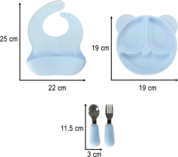 Komplet je izdelan iz kakovostnega silikona, primernega za stik z živili, brez škodljivih snovi; na dotik je mehak, trpežen in enostaven za pomivanje. Razdeljen krožnik v obliki medvedka olajša pregledno serviranje, slinček z globokim žepkom ohranja oblačila čista, ergonomski pribor z mehkimi silikonskimi ročaji pa se odlično prilega majhnim rokam.