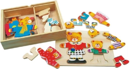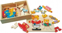 Leseni oblačilni puzzle od Bino prinaša zabavo in izobraževanje v enem praktičnem paketu. Otroci lahko vstavljajo dele v pokrov škatlice in ustvarjajo različna oblačila za medvede po lastni domišljiji.