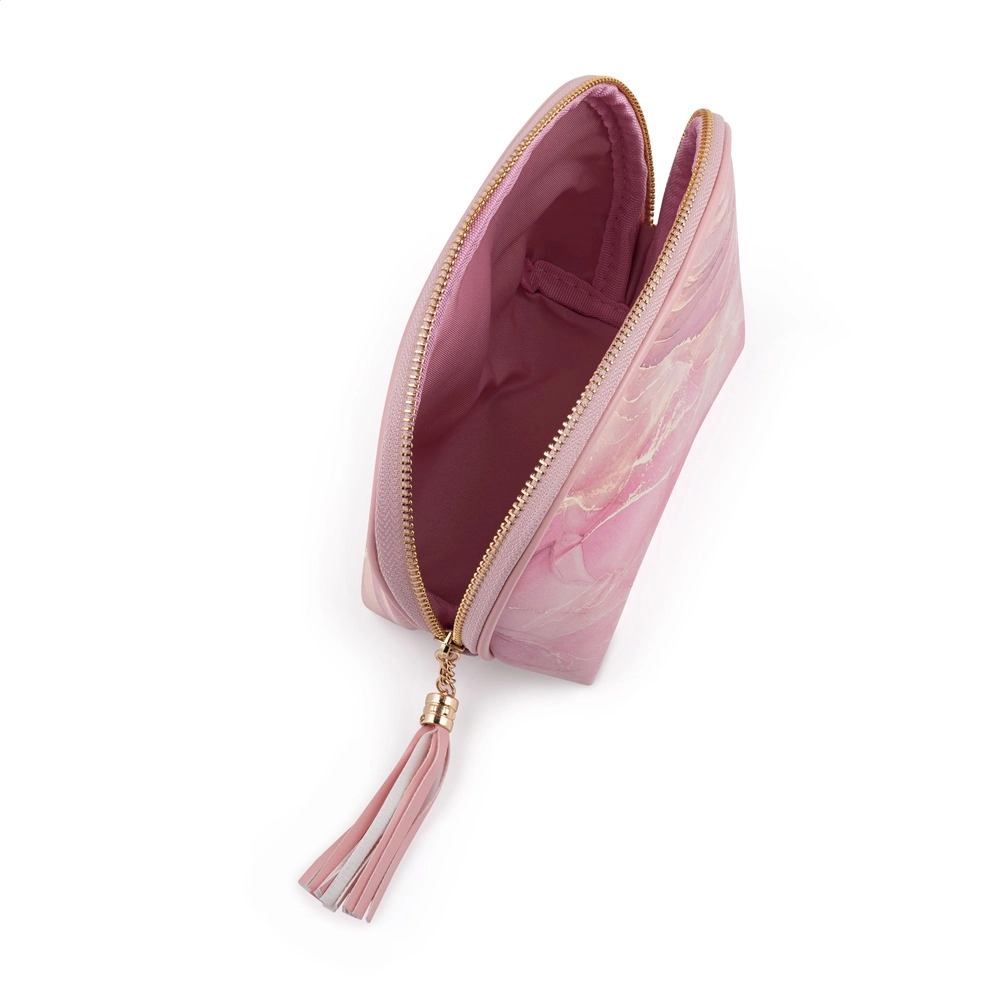 Ta elegantna potovalna kozmetična torbica je idealna za vsakodnevno uporabo in vikend izlete. Okrogla oblika in rožnata izvedba z marmoriranim vzorcem jo naredita vkusen dodatek, ki se zlahka prilega torbici, nahrbtniku ali ročni prtljagi.