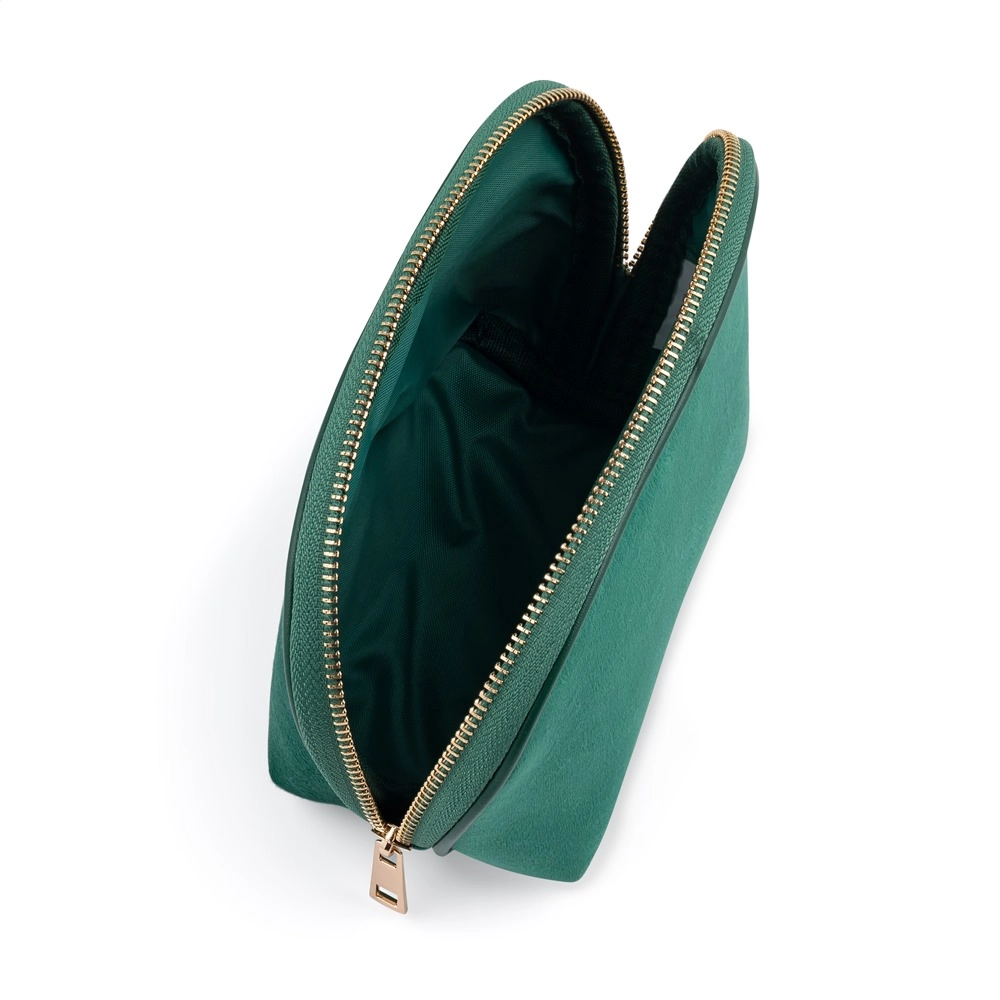 Ta stilska potovalna okrogla kozmetična torbica v zeleni barvi je odlična izbira za pregledno shranjevanje drobne kozmetike in toaletnih potrebščin. Eleganten videz z dotikom žameta deluje moderno in se zlahka kombinira z ostalo potovalno opremo.