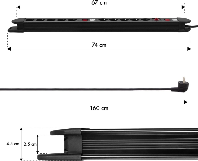 Z otroško zaščito so vtičnice varne tudi v družinskem okolju. Kompaktno, podolgovato ohišje s predpripravljenimi odprtinami omogoča preprosto stensko montažo pod mizo ali na steno. Maksimalna moč 3680 W in kabel 1,5 m zagotavljata zanesljivo delovanje v domu, pisarni in delavnici.