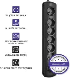 Varnost zagotavlja prenapetostna zaščita z varistorjem, vgrajene otroške zaščite v vseh vtičnicah in negorljiv PP material. Z možnostjo montaže na pohištvo in rešitvijo za navijanje odvečnega kabla boste imeli kable pod nadzorom, prostor pa bo videti čist in urejen.