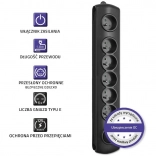 Varno napajajte več naprav z enega mesta z prenapetostnim podaljškom s 6 vtičnicami in 1,8 m kablom. Praktično osvetljeno nožno stikalo Quick Switch prihrani čas in energijo, otroške zaščite ter negorljiv PP material pa povečajo varnost. Eleganten črn dizajn, možnost pritrditev na pohištvo in pametno shranjevanje odvečnega kabla za red doma in v pisarni.