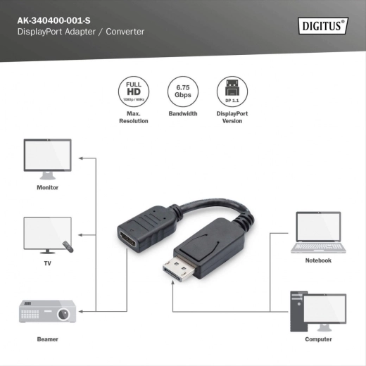 Ta kratek adapter DisplayPort (DP) na HDMI tipa A je idealen za priklop prenosnika ali namiznega računalnika na monitor, projektor ali televizor z vhodom HDMI. Zahvaljujoč zaponki na konektorju DisplayPort trdno sede v vrat in zagotavlja stabilno povezavo brez neželenega odklapljanja.