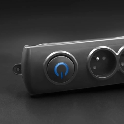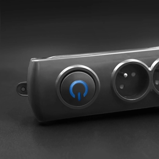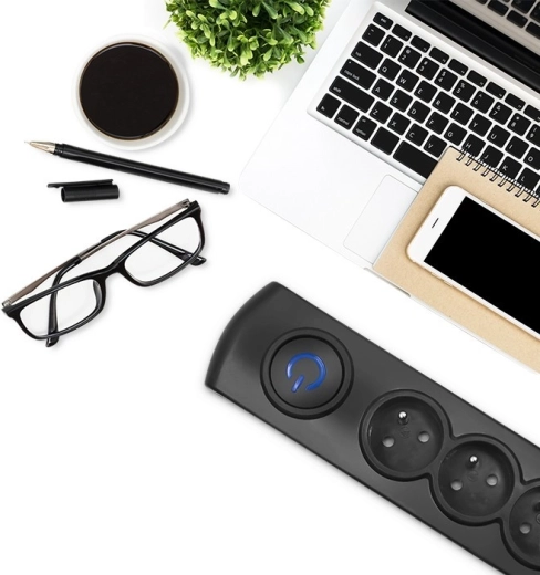 Osvetljeno stikalo omogoča takojšnjo prekinitev napajanja vseh naprav brez sklanjanja – idealno na tleh ob pisalni mizi ali TV sestavu.