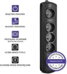 Upravljanje je maksimalno udobno zahvaljujoč osvetljenemu nožnemu stikalu Quick Switch – z enim pritiskom izklopite ali vklopite napajanje vseh priključenih naprav. Za varnost skrbijo prenapetostni elementi (varistor), otroške zaščite v vseh vtičnicah ter negorljiva izvedba iz PP.