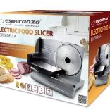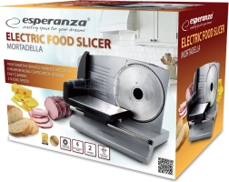 Električni rezalnik Esperanza Mortadella je opremljen z kovino, prevlečeno s kromom in nikljem, kar zagotavlja dolgo življenjsko dobo in preprosto vzdrževanje. Veliko nerjaveče rezilo s premerom 19 cm zlahka reže živila na enakomerne rezine.