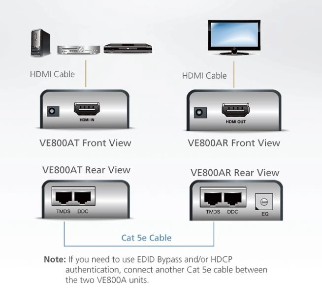 ATEN VE800A je zanesljiv HDMI podaljšek, zasnovan za primere, ko je treba vir in zaslon namestiti daleč narazen. Z enim kablom Cat 5e lahko prenese visokokakovostni avdio in video do 60 metrov, pri tem pa ohranja ostro sliko in tekoč prenos.