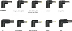 V paketu je 10 zamenljivih nastavkov za znamke, kot so ASUS, ACER, DELL, HP, TOSHIBA, SAMSUNG, SONY in druge – ena rešitev za več prenosnikov.