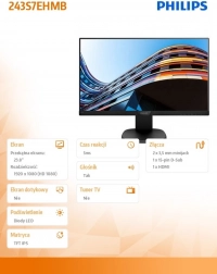Philips monitor z diagonalo 23,8 palca ponuja oster prikaz zahvaljujoč tehnologiji IPS. Omogoča prilagodljive možnosti povezovanja prek HDMI in ima funkcijo pivot za udobno vrtenje zaslona. Primeren je tudi za multimedijsko zabavo zaradi vgrajenih zvočnikov.