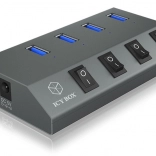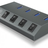 Vsak port ima samostojen izklopnik, zato lahko udobno upravljate priključene naprave brez odklapljanja kablov. Ob uporabi priloženega napajalnega adapterja 5 V/4 A deluje hub kot aktivni polnilec s podporo USB Battery Charging 1.2 (BC 1.2) – idealno za hitro polnjenje telefonov in tablic.