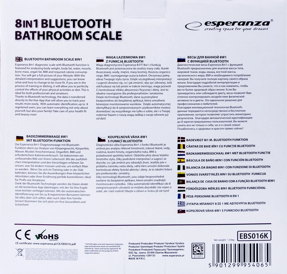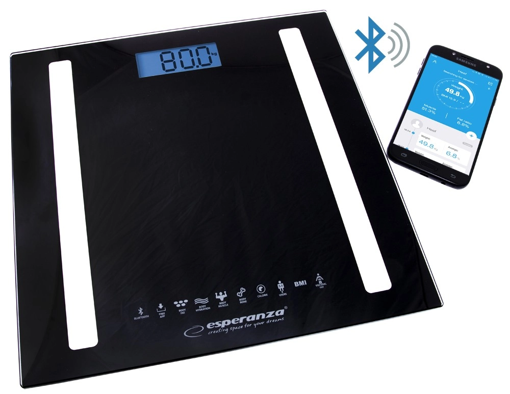 Odkrijte inovativno osebno tehtnico Esperanza »8v1« B.FIT, ki uporablja tehnologijo BIA (bioelektrična impedanca) za natančno analizo sestave telesa. Hitre in preproste meritve zagotovijo vse ključne informacije za spremljanje zdravstvenega stanja.