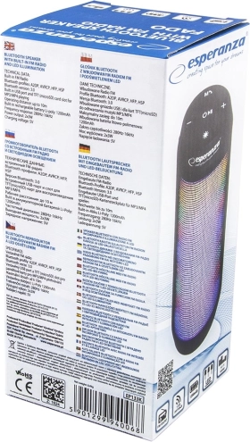 Esperanza Fado je stilski prenosni Bluetooth zvočnik s 360° mrežico, ki združuje močan zvok z učinkovitim svetlobnim šovom. Zahvaljujoč več vhodom predvaja vaše sezname predvajanja iz telefona, USB ključka in kartice microSD, hkrati pa služi kot prostoročna naprava za udobno opravljanje klicev.