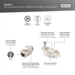 Oklopljen modul Keystone DIGITUS CAT 6A je zasnovan za namestitev brez uporabe orodja, kar zagotavlja enostavno in hitro montažo. Izpolnjuje standarde ISO/IEC 60603-7-51, 11801 in AMD2:2010-04. LSA sistem je barvno kodiran po EIA/TIA 568 A&B, kar zagotavlja združljivost in zanesljivost. Zaradi svoje kompaktne zasnove je združljiv tudi z oblikovno kompatibilnimi modularnimi vtičnicami.