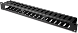 Trije široki prehodi z merami 30 × 130 mm olajšajo organizacijo in razbremenitev kablov, izboljšujejo pretok zraka ter prispevajo k čisti, profesionalni podobi namestitve. Črna izvedba RAL 9005 se odlično ujema z večino rack komponent.