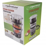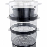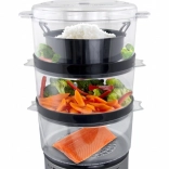 Tri prozorna nadstropja omogočajo sočasno pripravo različnih vrst živil – zelenjave, rib, riža ali mesa – brez prenosa vonjav. Časovnik in pregleden upravljalni panel vam dajeta nadzor nad procesom kuhanja, medtem ko kompaktna zasnova prihrani prostor na kuhinjskem pultu.