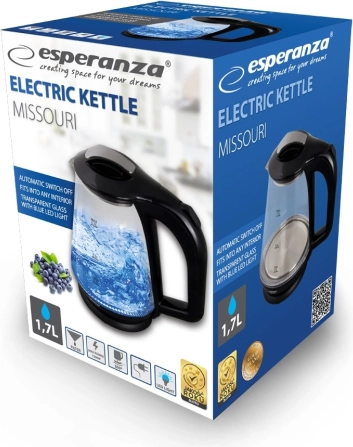 Steklen grelnik vode ESPERANZA MISSOURI s prostornino 1,7 l prinaša eleganten črn dizajn, modro LED osvetlitev, samodejni izklop in pregledno merilno lestvico nivoja. Zahvaljujoč toplotno odpornemu steklu in integrirani grelni plošči je vsakodnevno segrevanje vode hitro, varno in udobno.