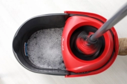Set vključuje vedro z vrtilnim mehanizmom, ki omogoča enostavno in higiensko ožemanje mopa brez dotika.