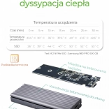Rebrasto aluminijasto ohišje, vgrajen hladilnik in termalna blazinica učinkovito odvajajo toploto, zato SSD ohranja visoke hitrosti tudi pri dolgih prenosih.