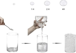 Po dodajanju vode perle v nekaj urah močno nabreknejo do približno 11 mm in so pripravljene za uporabo.