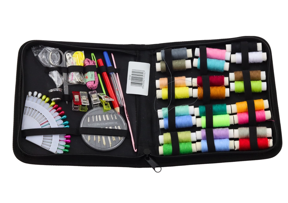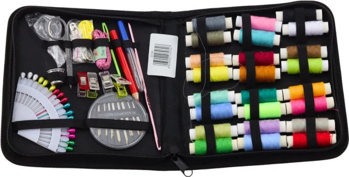 24 barvnih niti, igle, bucike, gumbi, vdevnik, paralnik, škarje, meter in druga orodja pokrijejo manjša popravila in večje prilagoditve oblačil.