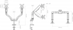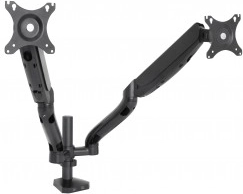 Držalo je opremljeno s plinsko vzmetjo, ki omogoča tekoče nastavljanje položaja monitorjev. To pomeni, da lahko zlahka najdete najudobnejši položaj za svojo delovno mizo. Dodatna prednost sta dva hitra priključka USB 3.0, ki zagotavljata enostavno povezavo vaših naprav z računalnikom. Prilagodljiva vrtljiva funkcija Pivot omogoča nastavitev v območju od -50 do +35 stopinj, največji razmik montažnih lukenj pa je 100×100 mm.