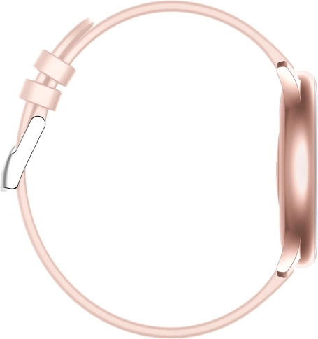 Stilna pametna ura z zaslonom na dotik in rožnatim paščkom za vsakodnevno fitnes rutino in življenjski slog. Spremlja korake, razdaljo, kalorije in srčni utrip, ponuja nadzor spanja, SpO2 in krvni tlak ter prikazuje obvestila z družbenih omrežij.