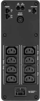 Na voljo je 8× IEC C13 (6 zasilno napajanih + 2 s prenapetostno zaščito), USB za komunikacijo in RJ45 za zaščito omrežne linije pred prenapetostjo.