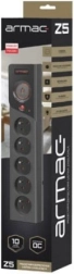 ARMAC Z5 je univerzalni prenapetostni razdelilec s petimi vtičnicami in kakovostno zaščito občutljive elektronike. Varistor vrhunske klase reagira v 25 ns in absorbira pulze do 6000 A, s čimer ščiti naprave pred nevarnimi napetostnimi sunki. Vgrajeni samodejni odklopnik 10 A/250 V omogoča enostavno obnovitev napajanja po odpravi vzroka napake.