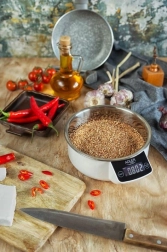 Tehtnica je opremljena s preglednim digitalnim zaslonom, funkcijo tara za ničljenje teže posode ter možnostjo samodejnega ali ročnega izklopa za varčevanje z baterijo. Koristen dodatek je način za merjenje volumna vode in mleka, ko nimate pri roki merilnega vrča.