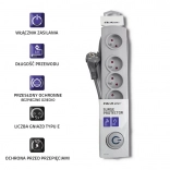 Praktičen prenapetostni podaljšek s 5 vtičnicami in 3 m kablom zagotavlja varno napajanje več naprav hkrati. Ponuja prenapetostno zaščito, osvetljeno nožno stikalo Quick Switch za udobno upravljanje brez sklanjanja in eleganten siv dizajn, ki se poda v pisarno, delavnico in dom.