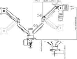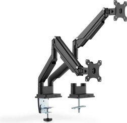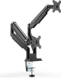 Dvojno ročno držalo za monitorje omogoča enostavno in ergonomsko delo z monitorji od 15" do 32". Držalo se preprosto nastavlja zahvaljujoč vgrajeni plinski vzmeti in ponuja široke možnosti postavitve za največje udobje.