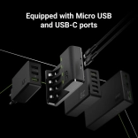 Polnilnik je opremljen z vratoma Micro USB in USB‑C, kar omogoča prilagodljivo povezavo z virom napajanja – od omrežnega polnilnika, prek avtomobila, do prenosnika ali power banke. Zaradi premišljene zasnove je enostaven za uporabo ter zagotavlja varnost pri vstavljanju in odstranjevanju baterij.