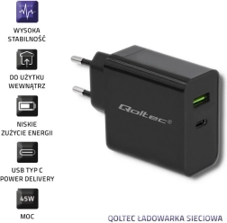 POWER DELIVERY (PD) pametno prilagodi napetost in tok priključeni napravi ter zahvaljujoč sodobnemu vmesniku USB‑C nudi visoko učinkovitost in univerzalnost. Moč 45 W zadostuje za pametne telefone, tablice in izbrane prenosnike, zato lahko en polnilec uporabite za več naprav.