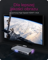 - HDMI do 3840 × 2160 @ 30 Hz; VGA do 1920 × 1080 @ 60 Hz