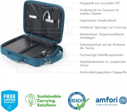 Praktična torba Eco Multi BASE s preklopom optimalno ščiti vaš prenosnik zahvaljujoč oblazinjeni pregradi za prenosnik. Naprave velikosti 14–15,6 so ne le optimalno zaščitene, temveč tudi pritrjene v pregradi s pomočjo zateznega traku. Dodatno stabilnost in zaščito zagotavlja kovinski žični okvir. Kot najlažja med torbami za prenosnike Eco Multi BASE zagotavlja prilagodljivo mobilnost. V praktičnem sprednjem predalu imate dovolj prostora za svoj pametni telefon ali drugo mobilno dodatno opremo, kot so kabli, pisala ali polnilniki, ki morajo biti vedno pri roki. Zahvaljujoč udobnim ročajem torba udobno leži v roki, z integriranim trakom pa jo lahko v trenutku pritrdite na voziček. Torbo lahko prenašate tudi z nastavljivim ramenskim trakom, kar Eco Multi BASE naredi idealno torbo za ljudi, ki veliko potujejo in želijo podpreti smiselno ponovno uporabo PET plastenk z okolju prijazno rešitvijo za prenašanje.
