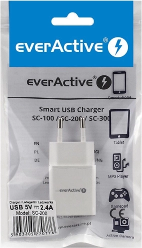 Iščete zanesljiv polnilec za telefon, tablico ali dodatke? Omrežni polnilec everActive z enim USB priključkom nudi stabilno moč 12 W in tok do 2,4 A, zato zlahka hitro napolni večino mobilnih naprav. Inteligentna tehnologija iQ Smart Charging samodejno prepozna priključeno napravo in ji prilagodi optimalni polnilni tok.