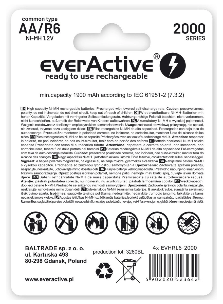 Set štirih polnilnih baterij AA s kapaciteto 2000 mAh v tehnologiji ready to use za takojšnjo uporabo. Idealne za fotoaparate, bliskavice, svetilke in prenosne predvajalnike. Ponuja zmogljivost primerljivo z alkalnimi baterijami, hkrati pa jih je mogoče večkrat napolniti do 1200× in bolje prenašajo visoke praznilne tokove.
