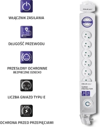 Prenapetostna zaščita je opremljena z različnimi varnostnimi elementi, kot so varistorji za zaščito pred visokimi napetostmi, zaščitne zapore, ki preprečujejo dostop otrok do vtičnic, in je izdelana iz negorljivega PP materiala za vašo varnost.
