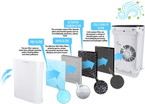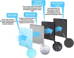 Zajame do 99,97 % alergenov, cvetnega prahu in prahu zahvaljujoč 4-stopenjskemu filtru: predfilter, filter z aktivnim ogljem, HEPA H11 filter in hladni katalitični filter.