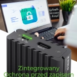 Natančno obdelano aluminijasto ohišje z rebrasto zasnovo skupaj z notranjim hladilnikom in termoblazinico učinkovito odvaja toploto za stabilno delovanje brez dušenja. Priročno stikalo za zaščito pred pisanjem varuje vaše podatke, LED‑dioda pa jasno signalizira delovanje in dostop do diska. V paketu najdete kable za USB‑C in USB‑A, tako da ste pripravljeni na katera koli vrata.