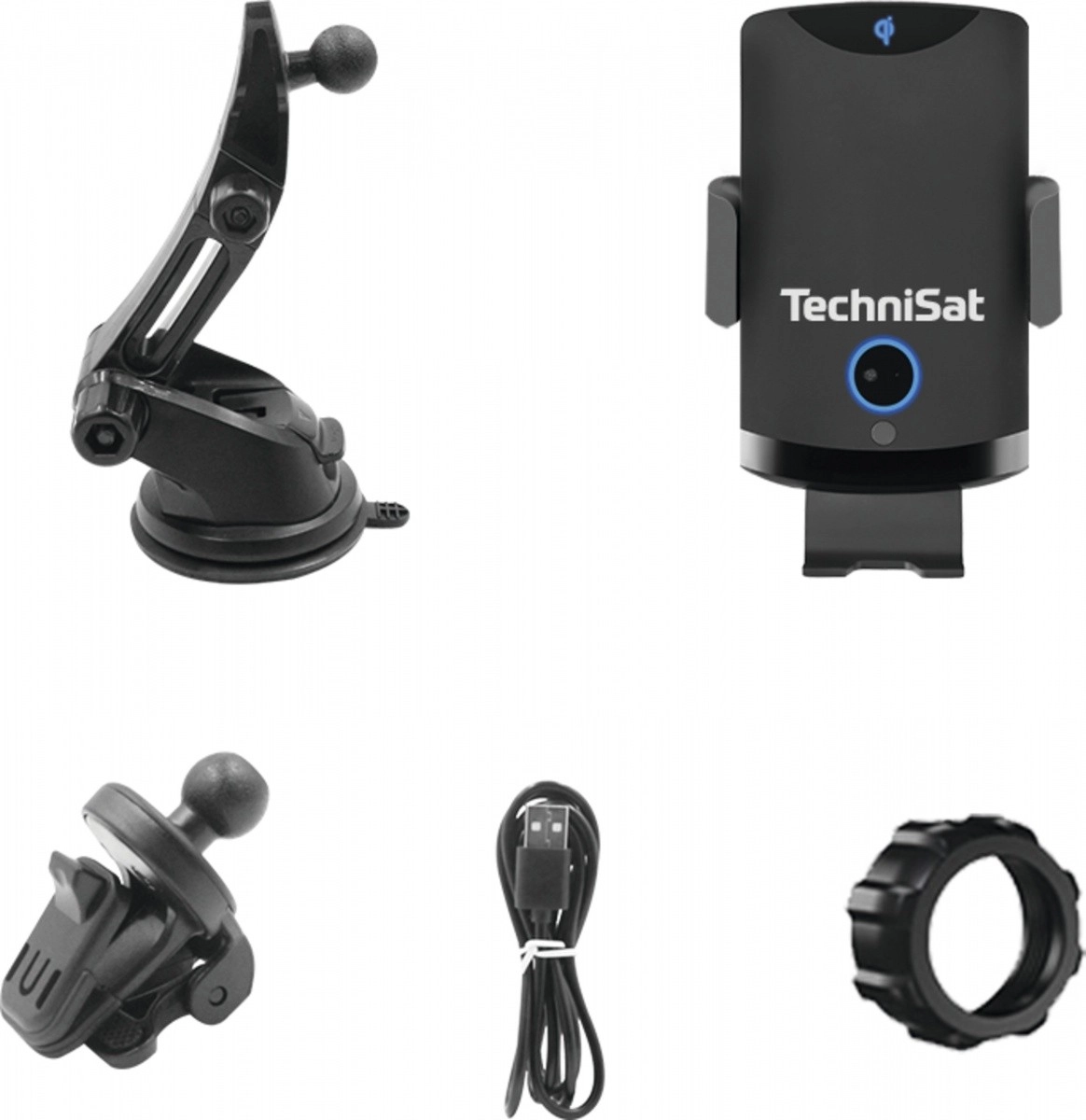 - Nosilec z brezžičnim polnjenjem, prisesni nosilec, sponka za prezračevalnik, USB‑C kabel, montažni obroč