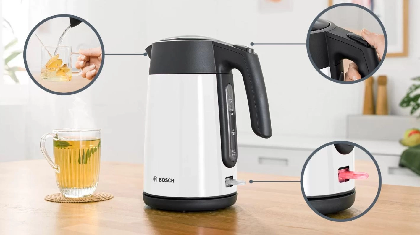 Vodo zavrite hitro, varno in varčno. Grelnik BOSCH 1,7 l združuje zanesljivo zmogljivost s praktičnimi podrobnostmi za vsakodnevno udobje: kazalnik ene skodelice zmanjšuje porabo, oblikovan izliv zagotavlja čisto nalivanje brez kapljanja, pokrov z odpiranjem na gumb pa poenostavi polnjenje in čiščenje.