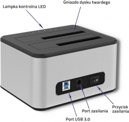 2× HDD/SSD velikosti 2,5" in 3,5" z enostavno povezavo prek USB 3.0 do 5 Gbps in podporo SATA I/II/III. Omogoča kloniranje brez povezave z enim pritiskom brez računalnika, ima funkcijo Plug & Play brez namestitve gonilnikov ter stabilno zasnovo z gumijastimi nogicami.
