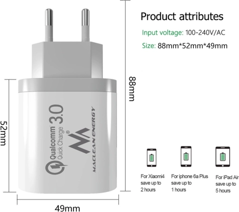 Polnilnik Maclean Energy vam omogoča polnjenje do 3 naprav hkrati zahvaljujoč trem vratom USB. Vgrajeni modul samodejno prepozna priključeno napravo in jo polni z največjim in zanjo ustreznim tokom. To zagotavlja najkrajši možen čas polnjenja.