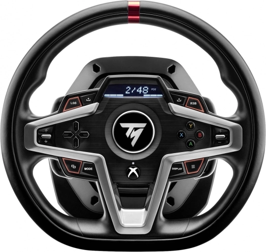 Thrustmaster T248 je izbira za igralce, ki želijo zmogljivost, potopitev in nadzor. Zahvaljujoč vgrajenemu zaslonu spremljate telemetrijo (vrtljaji, prestava, najboljši krog) in neposredno na volanu prilagajate ključne nastavitve – od vrste force feedbacka do kota zasuka.